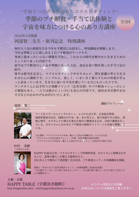 後半はマクロビオティックやカタカムナ、潜在意識の考え方を合わせた心の講座です。シンプルに、楽しく、いきいきと暮らすための知恵がぎゅっと詰まっています。生き方に迷いや不安を感じている方にもぴったりです。